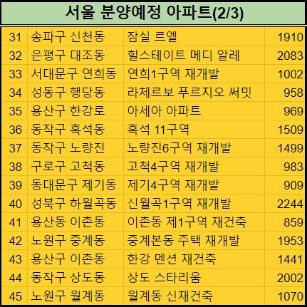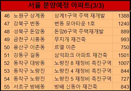 이렇게 서울에 분양예정인 아파트 55개를 표로 정리해서 알려드렸는데요.