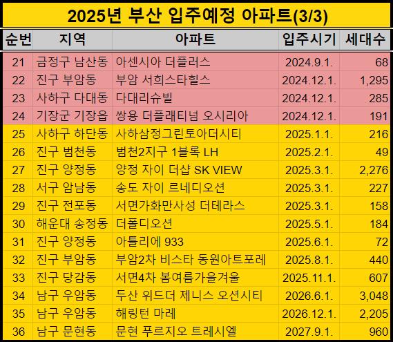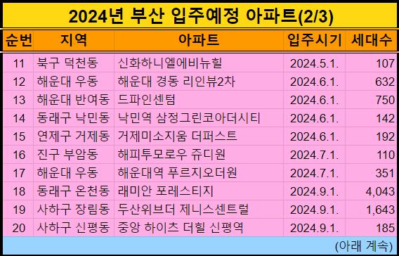 2024년 부산에 입주하는 아파트 36곳을 표로 정리했습니다.