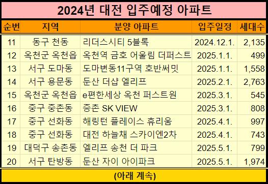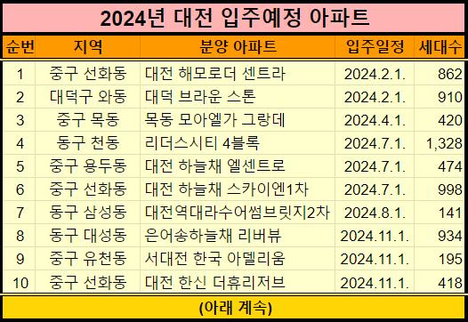 2024년 대전 아파트 입주계획을 표로 정리했습니다.