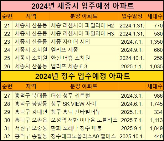 아래 2024년 세종시, 청주 입주예정 아파트도 표로 만들었으니 참고하세요.