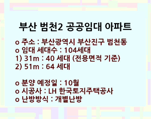 이렇게 부산 범천2에서 진행중인 LH 공공분양 및 임대아파트 일정에 대해서 살펴봤습니다.