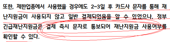 왜냐면요 체크카드나 신용카드로 충전된 긴급재난 지원금은 사용처에서 사용했을 경우 기존에 남아 있던 체크카드 잔금이나 신용카드 사용 금액보다 우선 결제됩니다 그래서 긴급재난 지원금을 사용처에서 사용하면 즉시 문자로 통보 돼서 재난지원금 사용 여부를 확인할 수 있다고 합니다.