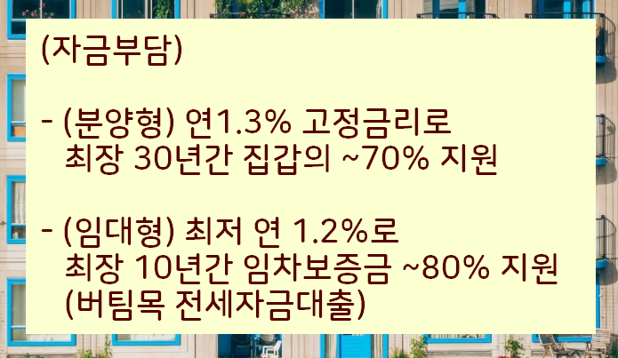 신혼희망타운 임대형아파트는 버팀목 전세자금을 이용하시면 됩니다. 낮은 이자 및 금리로 지원해주기 때문에 꼭 분양형 신혼희망타운으로 내 소유의 내집마련을 고집하실필요가 없다고 판단됩니다. 무엇보다 분양형의 경우 아래에서 알려드리겠지만 추후 아파트 매도시 지원받은 자금 비율에 따라서 시세차익의 일부분을 상환하는 경우가 있을수 있기 때문입니다.
