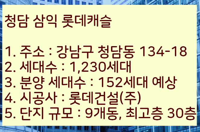 서울시 강남구에 아파트를 분양받아서 내집마련을 한다면 꿈만같을것같습니다. 특히나 그것도 강남구 청담동에 있는 한장쪽에 위치한 아파트를 분양 할 예정이라고 하는데요. 청담 삼익 롯데캐슬 아파트 분양일정은 12월로 알려져있지만 아직까지 참고정도로 알고계시는것이 좋을듯합니다.