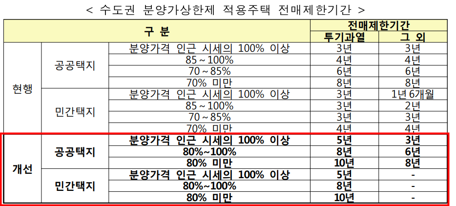 2. 민간택지의 경우, 분양가 상한제 전매제한 기간은 아래 표에서 참조하시기 바랍니다.