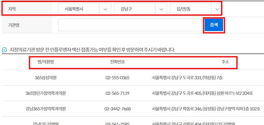 3. 거주하고있는 주소지 관할 지역을 선택하고 병원 검색을 합니다.