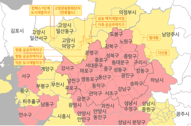 서울시의 경우에는 모든곳이 지금이 투기과열지구로 지정되어있습니다. 또한 경기도와 인천시의 e편한세상 부평 그랑힐스처럼 부평구의 인기있는 지역은 조정대상지역으로 지정되어있습니다.