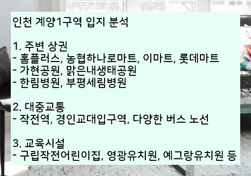 말씀드린 것처럼, 주변에 홈플러스와 이마트, 롯데마트 등이 있습니다. 또한 작전역과 경인교대입구역에서 가까우며 교육시설또한 잘되어있는 편이라고 생각합니다.