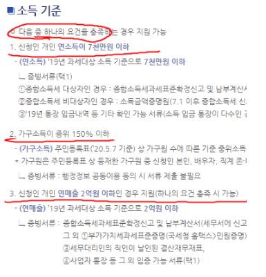 따라서 긴급 고용안정지원금을 신청하는 많은 분들이 자격이 소득 기준에서 연소득이 7천이거나 연매출이 2억이라서 신청자격이 되는줄 잘못알고 계십니다.