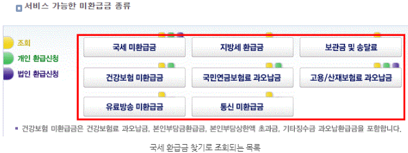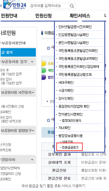 민원 24에서 국세환급금찾기로 조회되는 목록은 국세환급, 지방세환급, 보관료 송달료, 건강보험이 환급, 국민연금보험료 과오납금, 고용 산재 보험료 과오납금, 유료방송 미환급금, 통신 미환급금이 조회된다고 합니다.