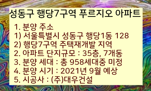 이렇게 서울시 성동구에서 분양하는 행당7구역 푸르지오 아파트 분양에 대해서 알아봤습니다.
