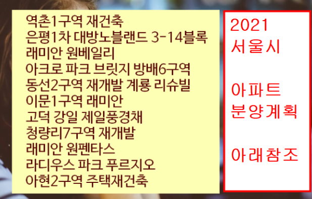 2021 서울시 아파트 분양계획 및 일정들을 정리포스팅을 아래 남겨놨으니 참조하세요.