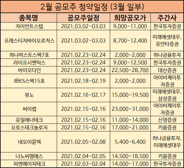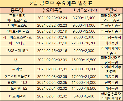 2021년 2월 공모주 청약일정, 상장일, 수요예측을 3가지를 아래에 표로 정리하였습니다.