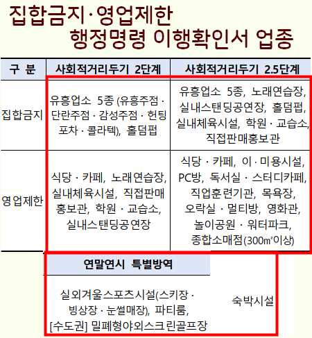 1. 집합금지업종 : 유흥주점, 단란주점, 감성주점, 헌팅포차, 노래연습장, 교습소, 학원, 실내체육시설 등이 해당됩니다.