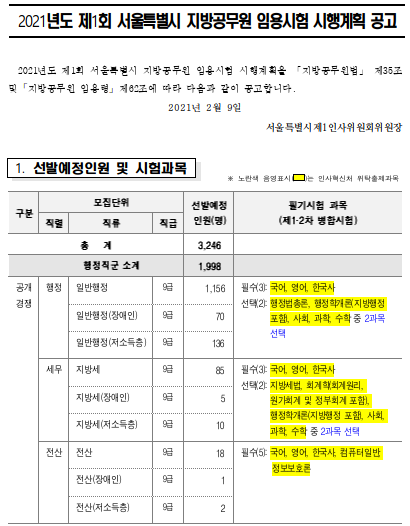 각 시험에서 채용하는 인원과 시험과목을 아래쪽에서 확인하세요.