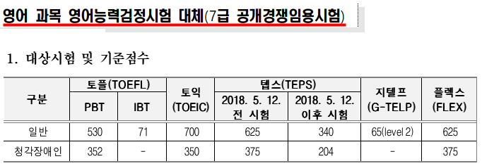 7급의 공개경쟁임용시험의 경우 영어능력거정시험 대체가 PBT, IBT, TOEIC 토익과 TEPS 텝스 등으로 가능하니 아래 참조하세요.