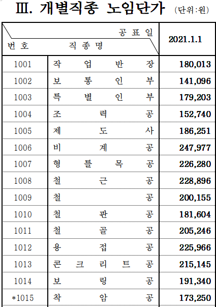 2021 상반기 노임단가중 낮은 보수의 기술자 및 노동자분들의 처우가 점점 나아지길 바랍니다.