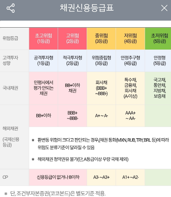 초저위험 5등급은 국고채, 지방채 등 보시듯이 다음의 것들이 있습니다.
