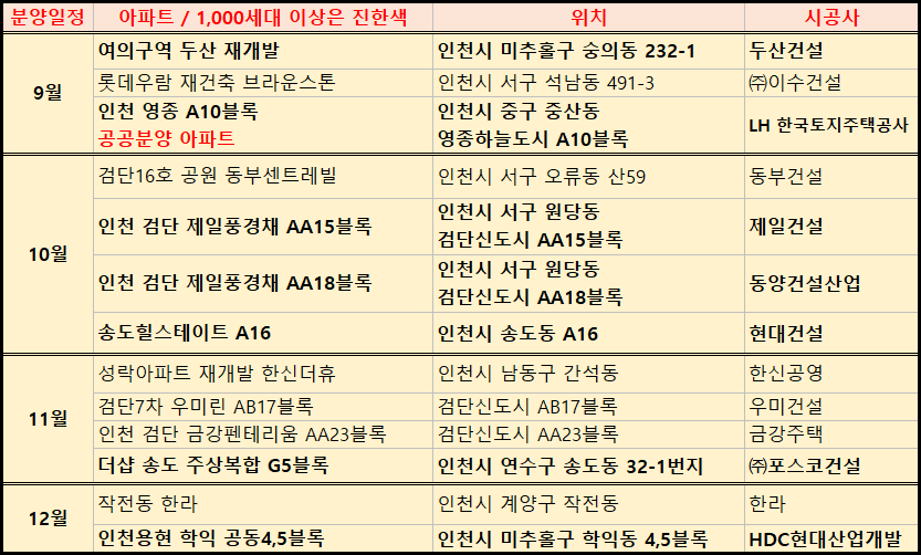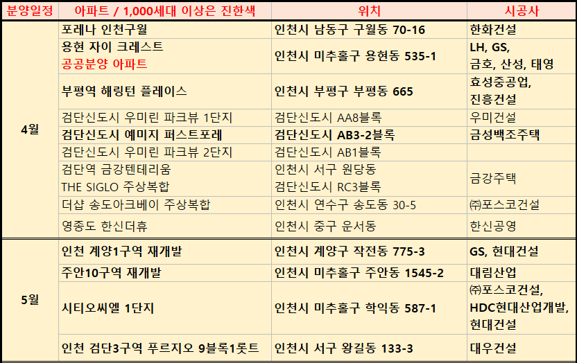 이번에는 2021년 인천 아파트 분양계획 및 청약일정을 표로 정리하였습니다.