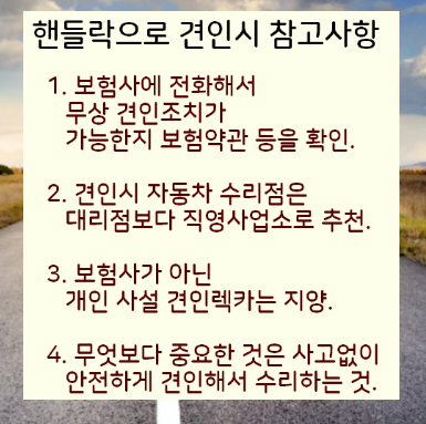 사설 견인 렉카에게 견인을 요청하지마시고, 꼭 보험사에 무상 견인조치를 요청하시기를 권해드립니다.