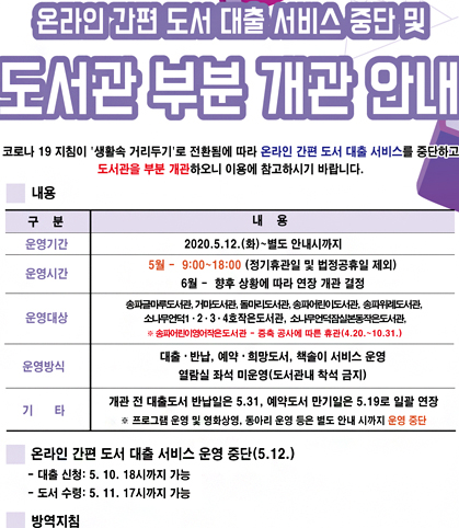 코로나로 인한 휴관중이 도서관 열람 소식은 각 도서관의 홈페이지에서 확인을 하실 수 있는데요.