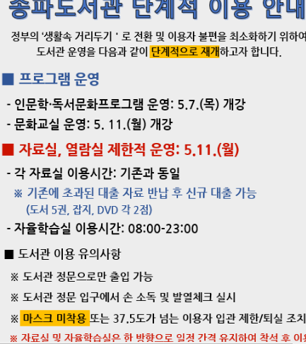 다행히도 송파도서관의 열람실은 5월 11일부터 제한적으로 운영하고 있습니다.