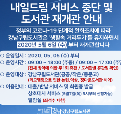 강남 구립도서관의 경우, 위에서 보시는 것처럼 2020.5.6.부터 주중 9시부터 18시까지 개관하였고, 주말의 경우 9시부터 17까지 개관하였습니다.