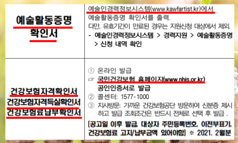 3. 예술활동증명확인서(예술인경력정보시스템) / 건강보험서류(국민건강보험 홈페이지)