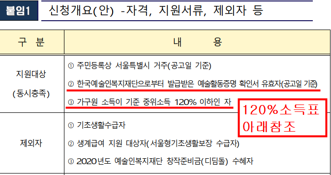 1. 지원대상 : 서울시 거주하는 예술활동증명 확인서 발급이 가능한 120% 소득자.