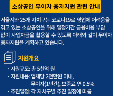 1. 서울시 소상공인 무이자 융지는 각 자치구별로 공지사항을 확인하시기 바랍니다.