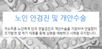 2. 개안수술 : 만60세 이상 기초생활수급자, 차상위계층, 한부모가족 어르신 등 수술비 본인부담금 전액 지원.