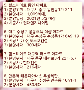 이렇게 2021년 대구에서 분양하는 아파트 목록을 정리하였습니다.