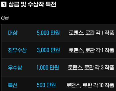 첫번쨰. 대상은 5,000만원으로 로맨스와 로맨스판타지 각 1작품을 선정.