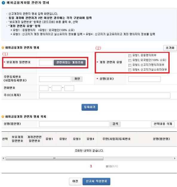 2) 보유계좌 일련번호 : 관련자 계좌조회에서 '해외금융계좌 명세'에서 이미 입력한 계좌를 선택합니다.