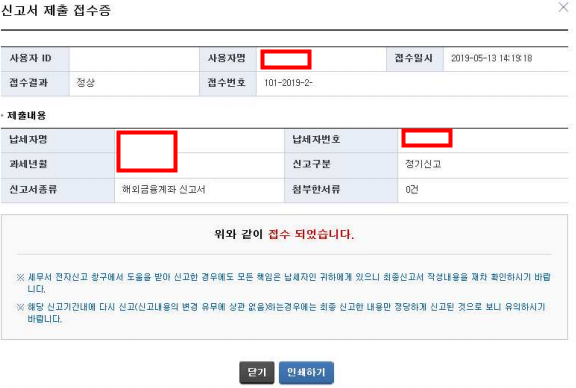 3. 아래처럼 해외금융계좌 신고서 제출하기 최종화면이 표시되고 접수증을 인쇄하실수있습니다.