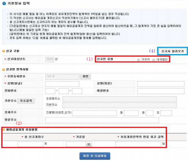 해외금융계좌 명세서를 작성하는 화명이 이렇게 표시됩니다.