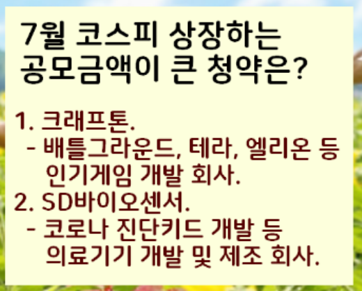 7월에 가장 기대되는 신규상장할 주식은 바로 크래프톤과 SD바이오센서가 아닐까 생각됩니다.