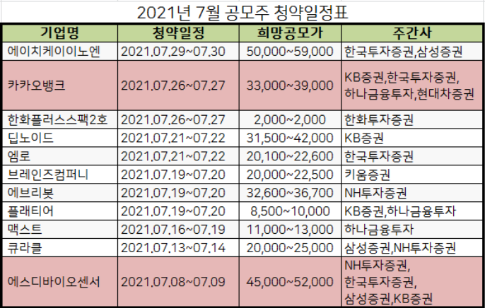 7월 신규상장 주식들의 청약일정을 표로 정리하였습니다.