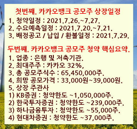 이렇게 오늘은 2021년 7월26일에 예정되어있는 카카오뱅크 공모주 청약에 대해서 알아봤습니다.