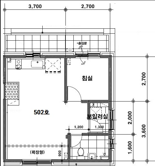 청년임대주택 평면도중에서 그나마 큰 편인 방의 평면도인데요.