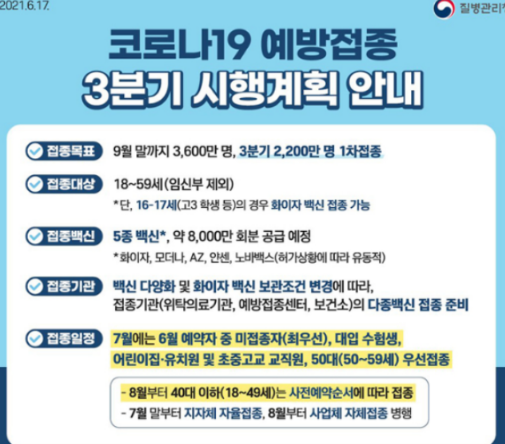 그 후에는 8월에는 18세부터 49세까지 40대 이하 대상이 모더나 백신 등을 접종 가능하다고 예정입니다.