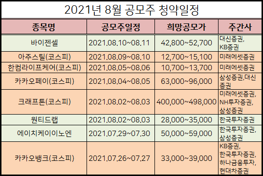 2021년 8월 최대의 관심 공모주는 카카오페이라고 생각합니다. 카카페오페 공모주 청약방법, 주관사, 수혜주 등을 분석해보겠습니다. 아래 202년 8월 공모주 청약일정도 표로 정리해놨으니 참고하