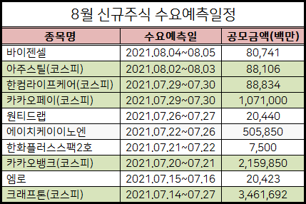 또한 2021년 공모주 청약일정표와 수요예측일정도 표로 정리해서 위에 첨부해드렸으니 참고하시기 바랍니다.