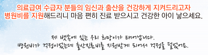 의료급여 수급자 분들의 임신과 출산을 건강하게 지켜드리고자 병원비를 지원해드리니 마음 편히 진료 받으시고 건강한 아이 낳으세요. 제 뱃속에 있는 우리 희망이가 태어납니다. 병원비가 걱