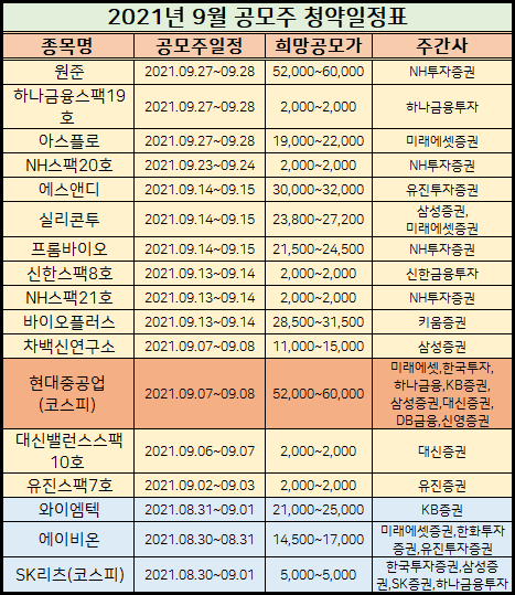 아직 2021년 9월 공모주 청약일정이 모두 공개가 안되어서 계속 업데이트 하겠습니다.