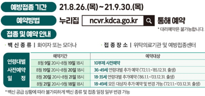 이렇게 18세 49세 코로나 백신 종류(모더나, 화이자)와 예익시간(해당일 20부터 다음날 18시까지)를 모두 알려드렸습니다.