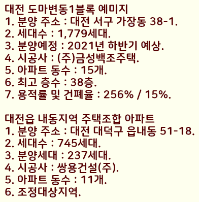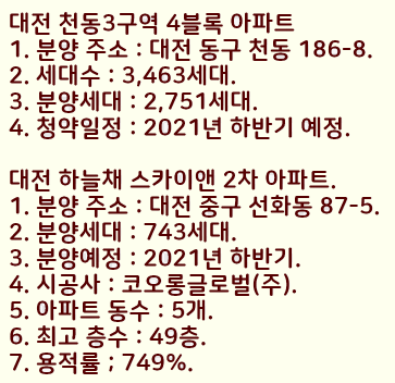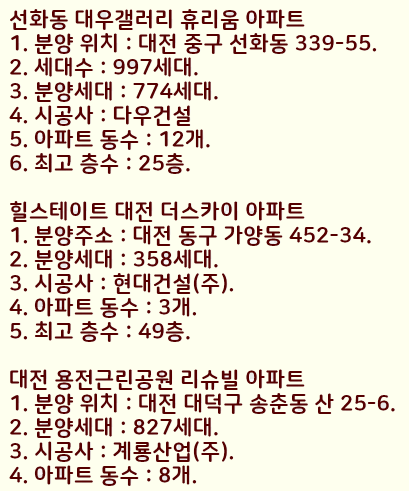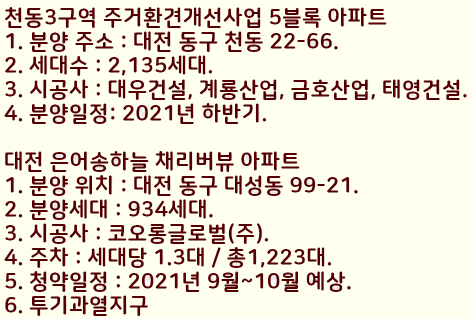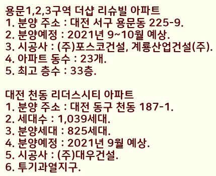 이렇게 2021년 9월부터 12월까지 대전에서 분양예정인 아파트들을 정리하였습니다.