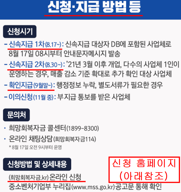 세번쨰. 확인지급 대상자 : 9월말부터 5차 재난지원금 신청사이트인 희망회복자금.kr에서 지원하시면 됩니다.