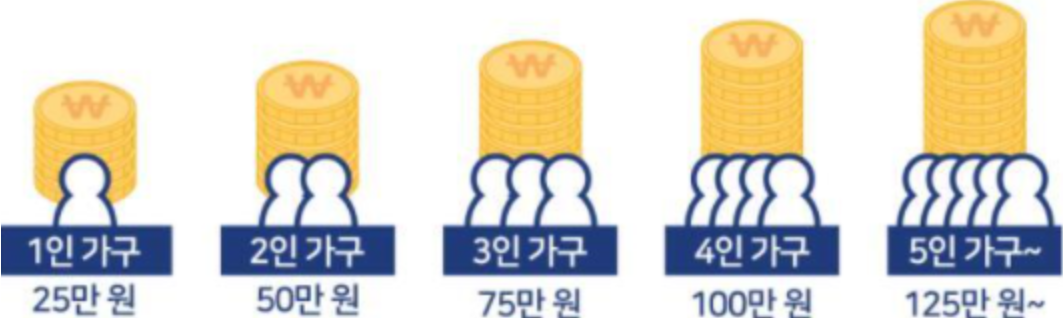 1. 국민지원금 금액 : 1인당 25만원 / 예) 4인가족이면 100만원.