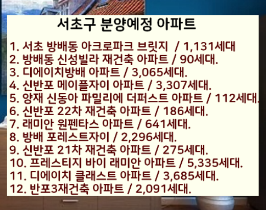 더불어 같은 분양단지 지역인 서초구에서 분양예정인 아파트 목록을 첨부하였으니 참고하시기 바랍니다.